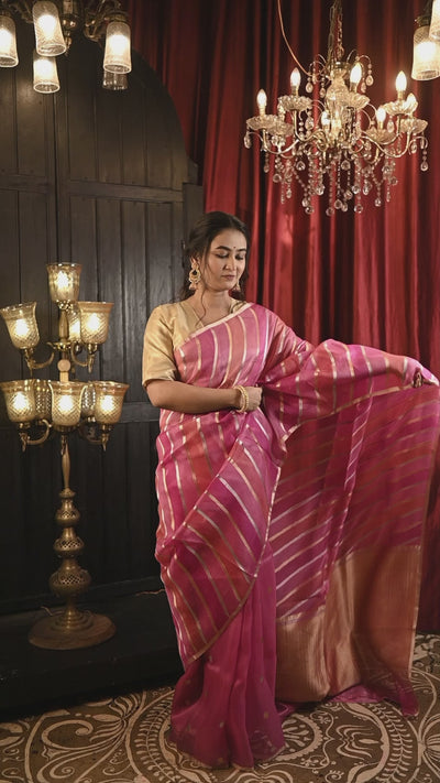 Kashish || Magenta, Onion Pink & Watermelon Pink Rangkaat Kora Silk Handloom Banarasi Saree with half & half 'Sona-Rupa' Zari Kadhua Buta and Stripes