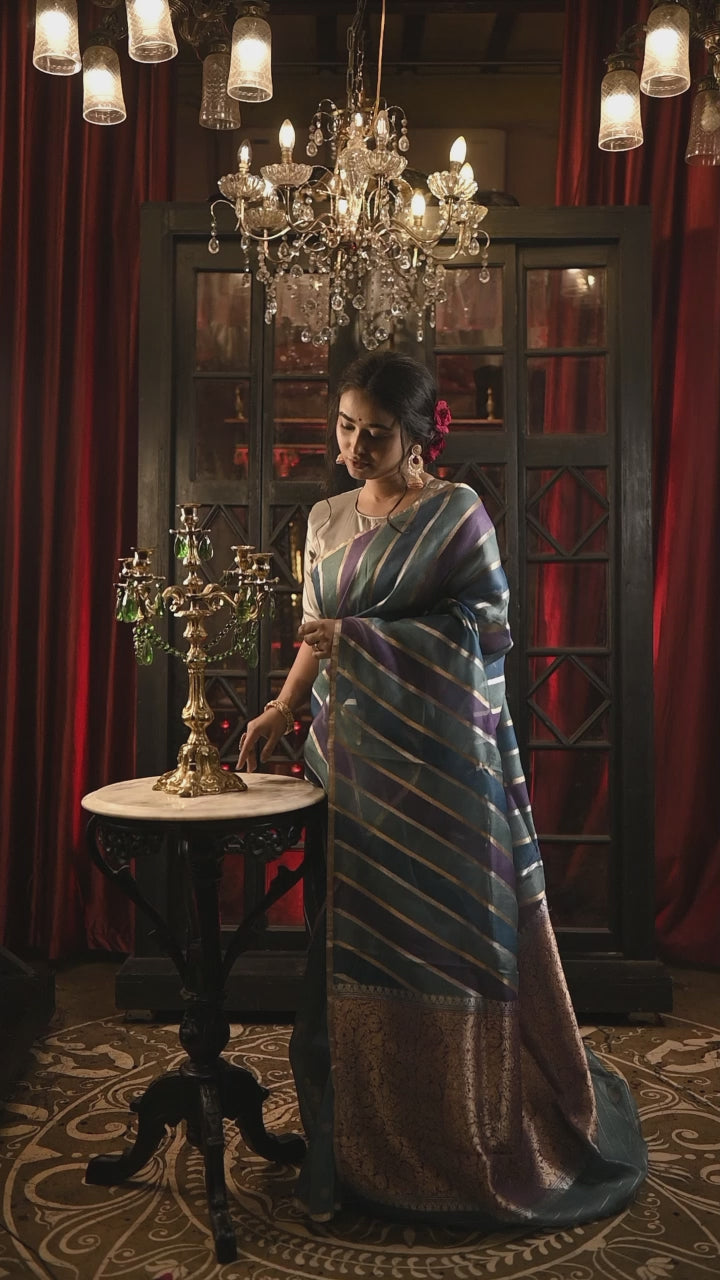 Woven from lightweight, sheer Kora silk, it drapes with ease, making it an effortless choice for elegant gatherings, twilight festivities, or cultural celebrations. The cool, moody palette brings a sense of quiet sophistication, perfect for women who appreciate understated luxury.