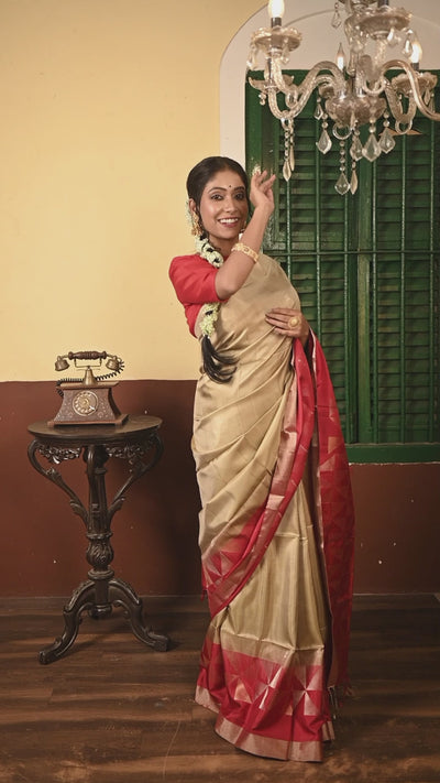 Ranjitha || Beige Gold Pattu Soft Silk Handloom Saree with all over Matte Gold & Matte Silver Zari Abstract Buta, Plain Copper Border and Red Border & Pallu in Antique Gold & Antique Silver Zari Abstract Triangle design