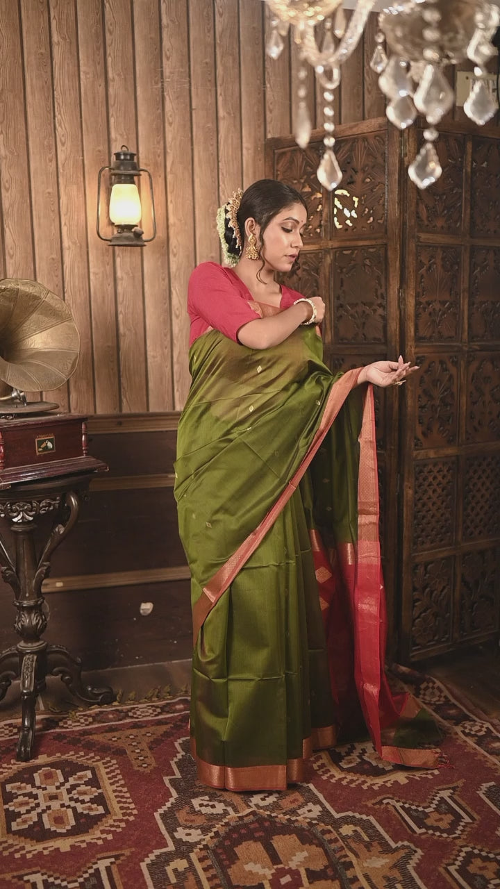 Vidushi || Dark Moss Green Cotton Resham Maheshwari Handloom Saree with all over Matte Gold Zari Buta, Red Clay & Antique Gold Zari Brocade Border and Red & Antique Gold Pallu with Stripe & Traditional Motif