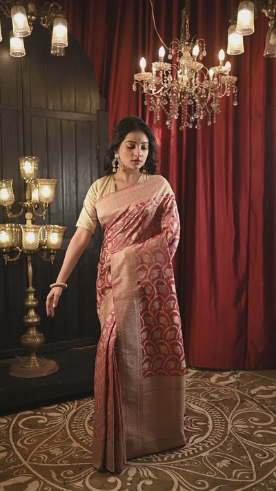 Mugdha || Coral Pink Matka Silk Banarasi Saree with all over woven Matte Gold Zari Floral Jaal