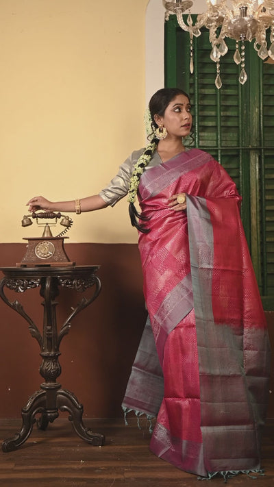Kusumlata || Beetroot Red & Purple dual tone Pattu Soft Silk Handloom Saree with all over Matte Silver Zari Abstract design, Light Dusty Blue & Purple dual-tone Border and Pallu with Matte Silver Zari Traditional design || BB-DM1|7B