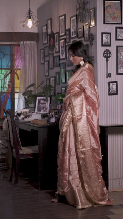 The metallic pale copper shade, with its light and dark tones, creates a dynamic visual appeal, enhanced by the rich hand embellishments that showcase exquisite artisanal skill. This saree is a celebration of opulence and tradition with a contemporary edge.