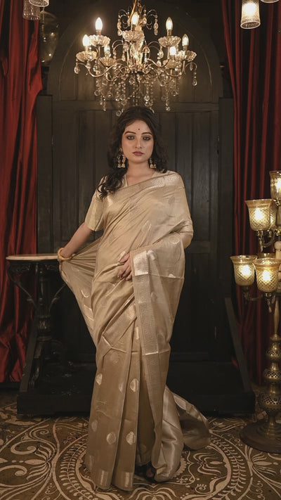 Sanaya || Light Taupe Brown Chinia Silk Banarasi Saree with all over Buta & Stripe Pallu woven in Silver Zari
