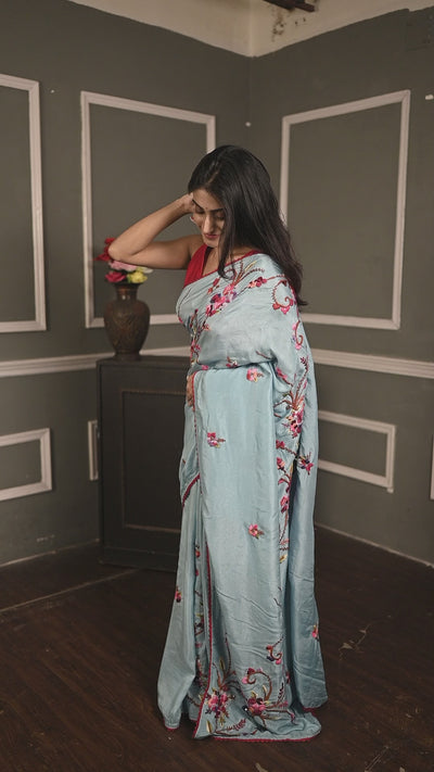 Roya || Sky Blue Russian Silk Hand Embroidery Saree with all over Multi-colour Resham Boolean Parsi Floral motif and Sequins Highlights
