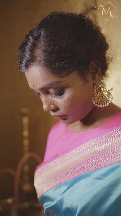 Elegant and refreshing, the Sky Blue Pure Katan Handloom Banarasi Saree from our Rivaayat Collection embodies timeless beauty and meticulous craftsmanship. The serene sky blue base is adorned with intricate all-over copper zari Kadhua buta, lending a warm glow and delicate texture throughout. The vibrant magenta border adds a striking contrast, enhancing the saree’s graceful charm.