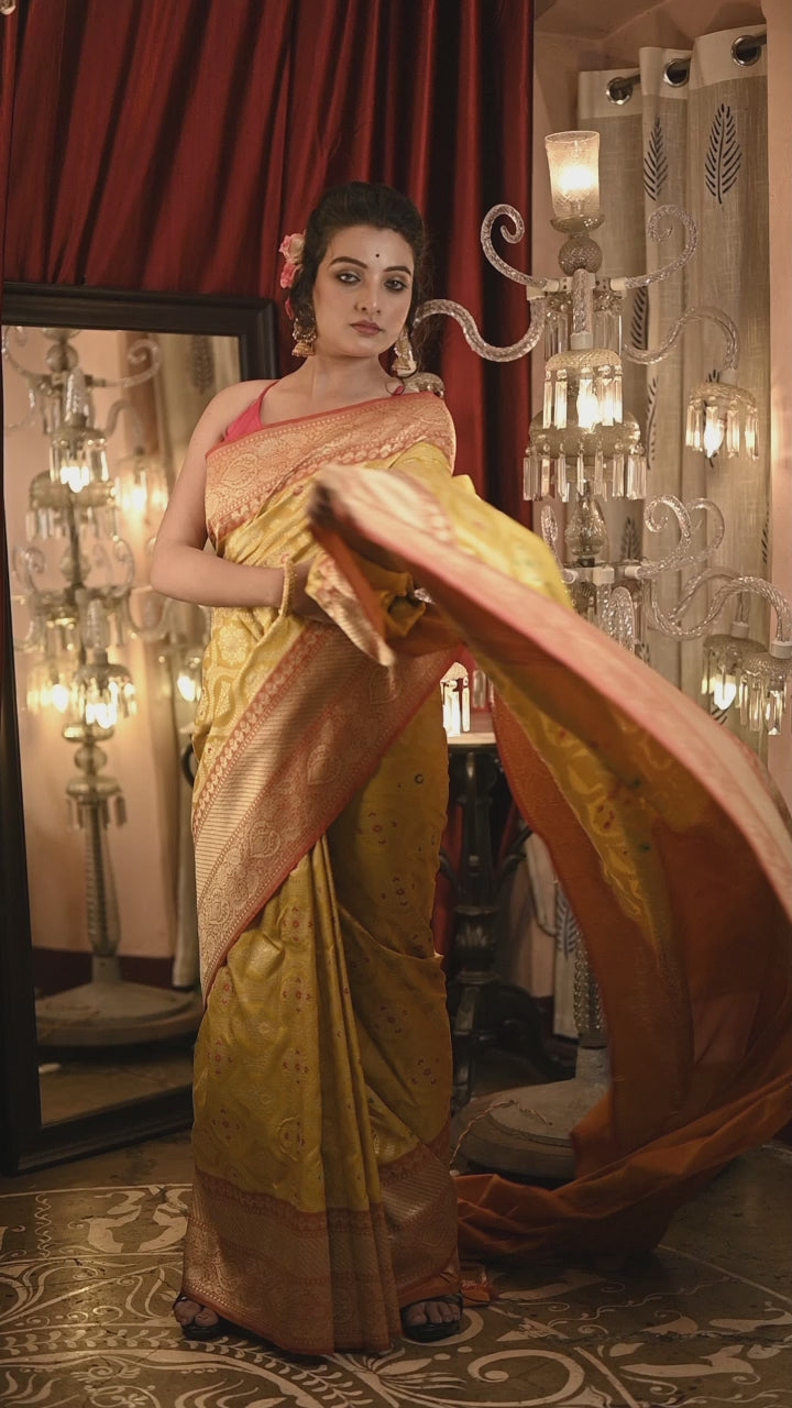 Ravina || Turmeric Yellow Matka Silk Banarasi Saree with Pale Orange border, all over Floral Jaal woven in Matte Gold Zari and multi-colour Meenakari highlights