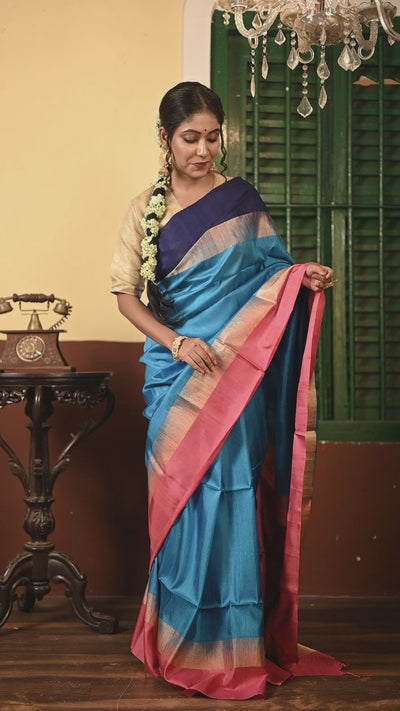 Vijitha || Cobalt Blue Pattu Soft Silk Handloom Saree with Plain body and Antique Gold Zari, Blush Pink & Midnight Blue 'Ganga Jamuna' broad Plain Border & Pallu with Handwoven Resham highlights