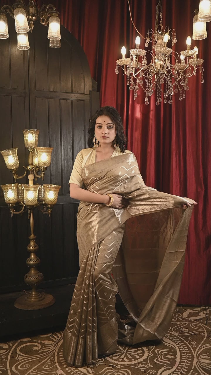 From our Sabhyata Collection comes a saree that perfectly balances tradition and grace. Crafted with exquisite detail, this piece features all-over buta motifs and a stripe pallu woven in silver zari, radiating quiet sophistication. The fabric you’ll fall for is the Medium Taupe Brown Chinia Silk Banarasi Saree, a subtle yet elegant shade that enhances the intricate design and lends itself beautifully to various occasions.