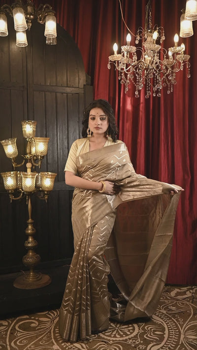 Urmika || Medium Taupe Brown Chinia Silk Banarasi Saree with all over Buta & Stripe Pallu woven in Silver Zari