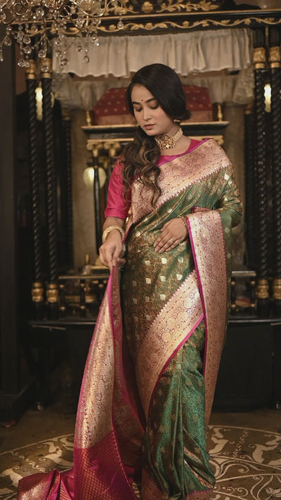 Vanisha || Traditional Banarasi Jamawar Saree on Green dual-tone Katan with all over Light Gold Zari Buta, Floral Jangla and Magenta Pink Border