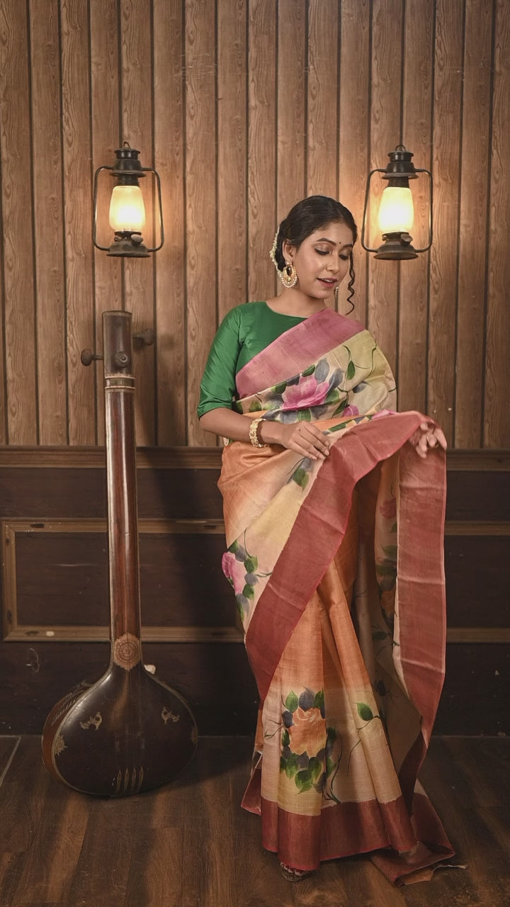 Shilpi || Apricot Brown & Multi-colour shaded Pure Tussar Handloom Silk Saree with Onion Pink-Gold Zari & Dark Dusty Pink-Copper Zari 'Ganga Jamuna' Border and Multi-colour Foral Hand Paint Body & Pallu