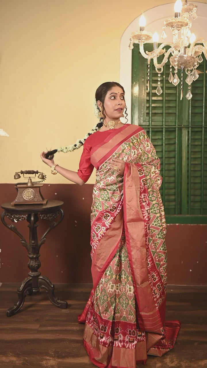 Vinitha || Sap Green, Off-white & Pale Maroon shaded Pure Silk Ikkat Handloom Saree with full body traditional Ikkat design and Dark Red & Golden Zari Border & Pallu