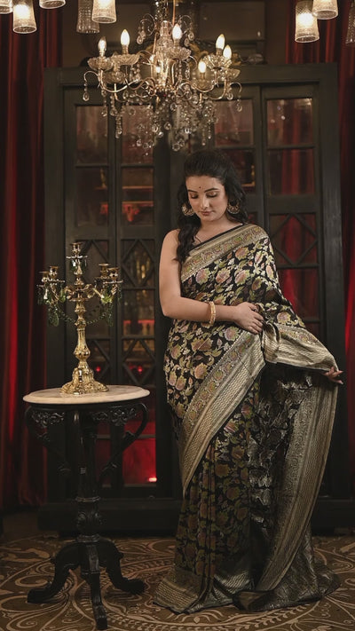 Ilyana || Black Khaddi Georgette Banarasi Saree with all over Rifling Handbrush Multi-colour & Antique Silver Zari Floral motif Jangla