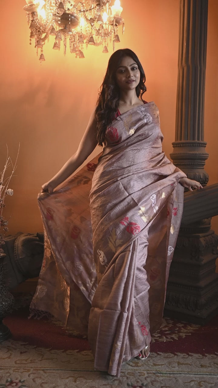 Roja || Rosy Brown Pure Tussar Silk Saree with Red & White Rose Motif and Antique Gold highlights Border & Pallu