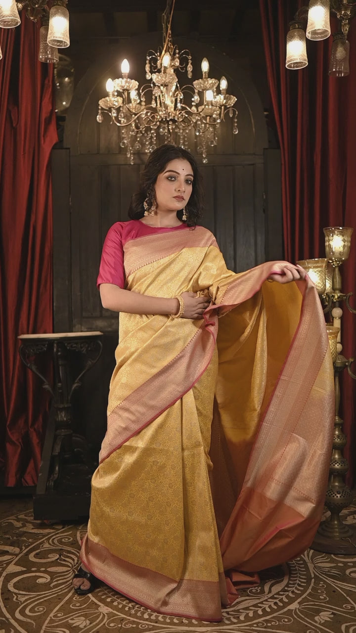 Aruni || Turmeric Yellow Matka Silk Banarasi Saree with all over Floral Jangla woven in Matte Gold Zari and Peach Pallu